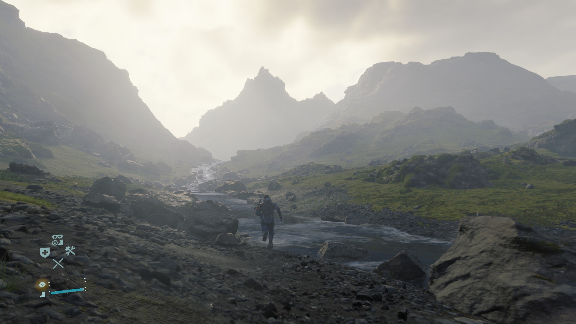 死亡搁浅不像一般的rpg以繁琐复杂重复的战斗作为延长游戏时间的手段,安安静静的送货就是游戏的一部分,我个人是非常喜欢这种形式,当一个人走在大山之中河流之上,总会让我沉浸于送货以至于偶尔的战斗也会让人厌烦,不过这样也显得听着音乐的送货过程无比安心无比珍贵,随着主线的推进,在游戏性上一直都给人惊喜,各式各样的玩法,以高科技为基础奇思妙想出的道具与设施使得我们的送货过程充满了可能性,送货方式不再单一,这真的很振奋人心,做出一款送货游戏并不难,但死亡搁浅的送货不是游戏里的送货而是送货的游戏